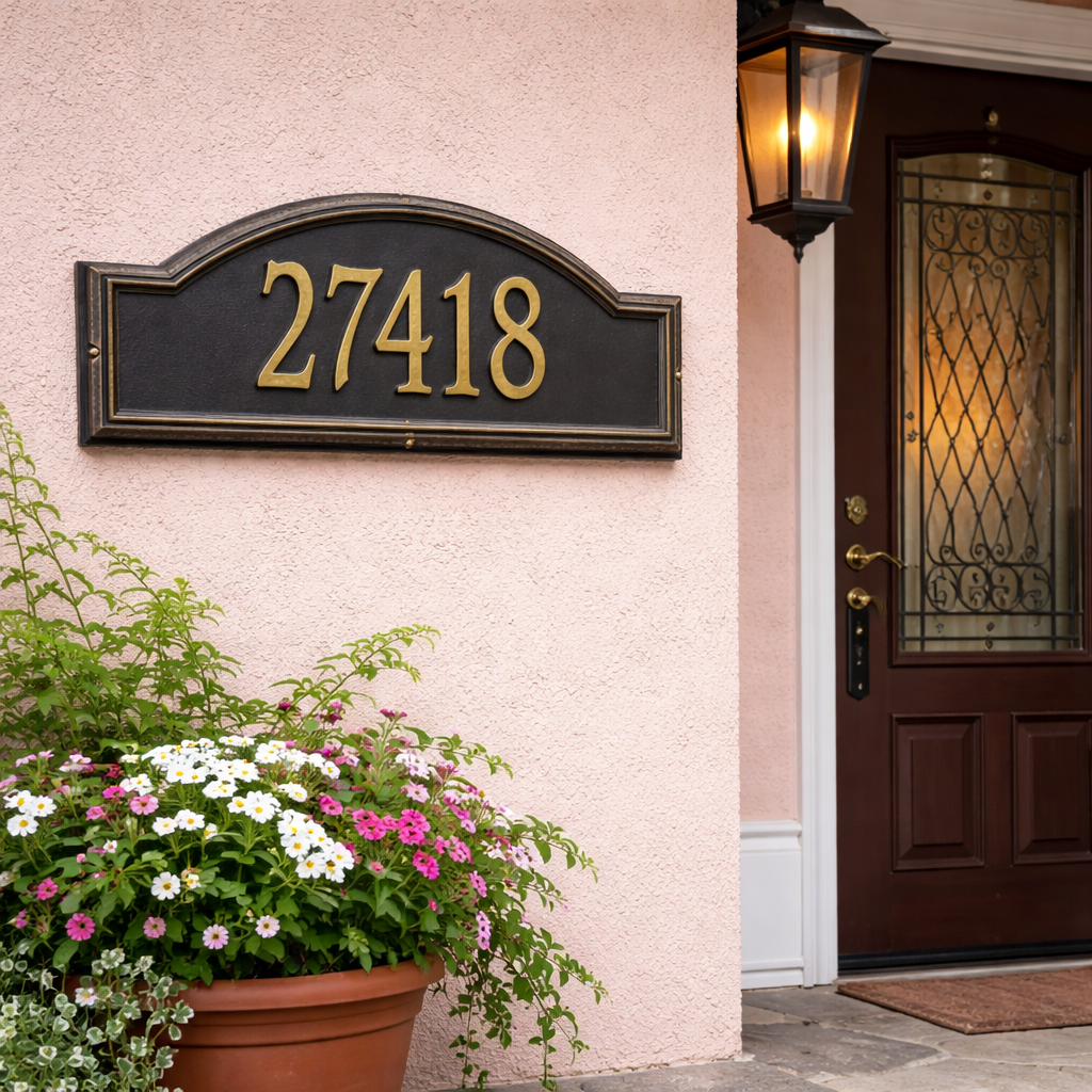 For the best aesthetic, we recommend using ALL CAPS for house numbers and Title Case (e.g., The Hamiltons) for names.
